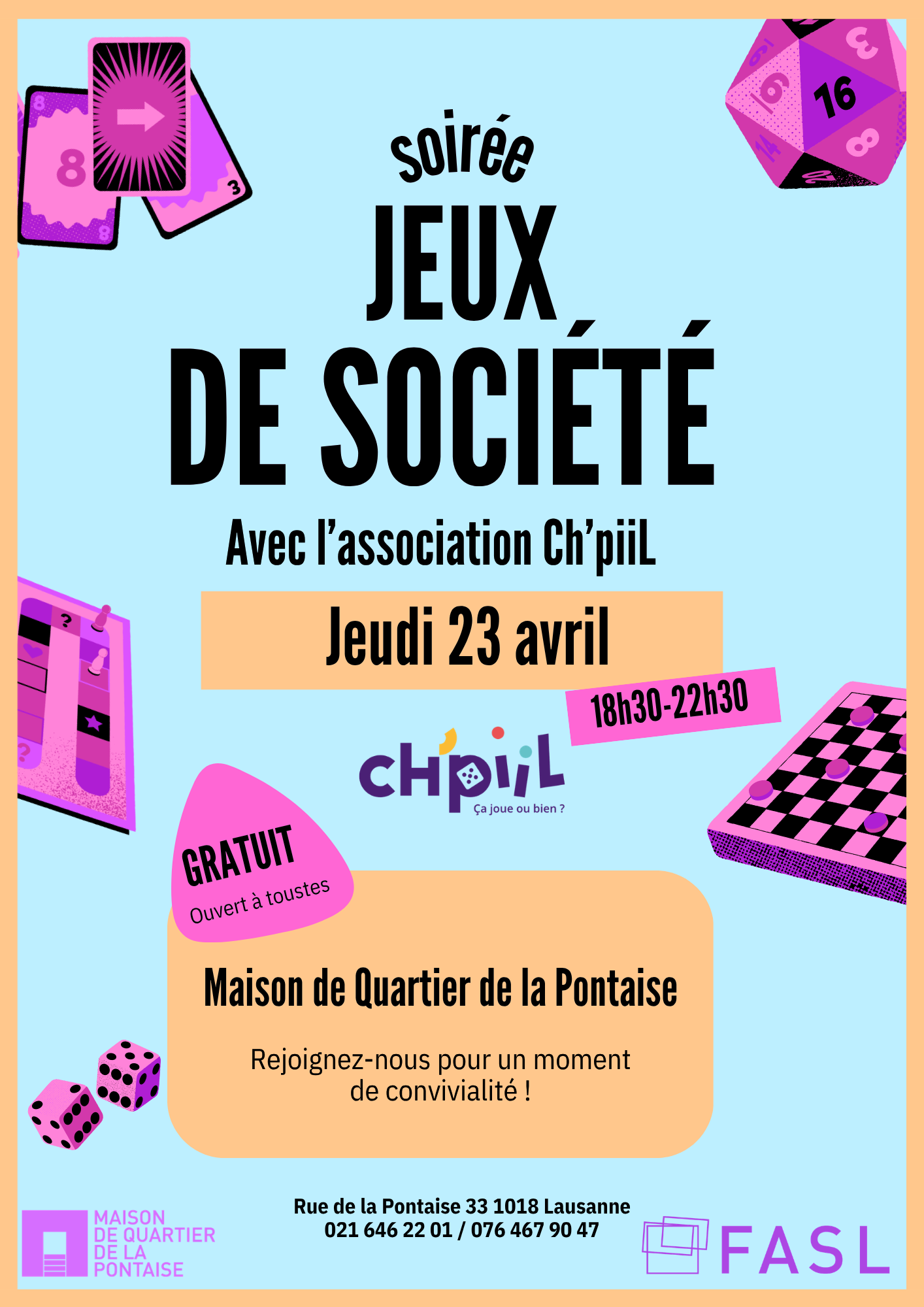Vous êtes les bienvenu-e-s à la soirée jeux avec l'association Ch'pill à la Maison de Quartier. Venez, seul-e-s ou en famille, rencontrer les bénévoles extraordinaires de Ch'pill qui vont présenteront les nombreux jeux de société disponibles.