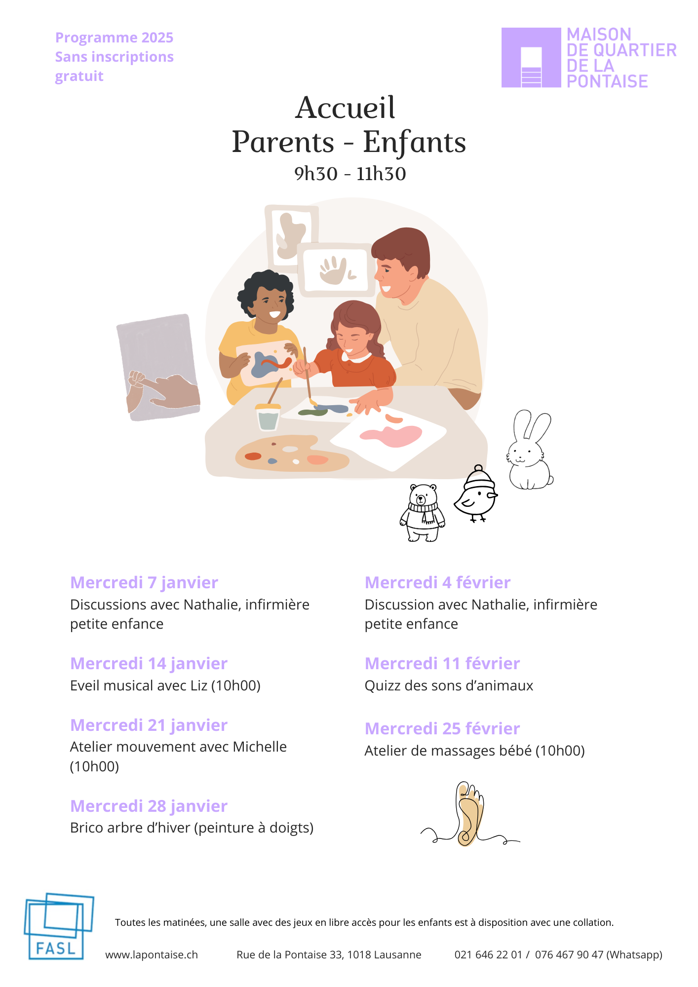 Un accueil pour les enfants (de 0 à 6 ans) accompagnés d’un adulte (parents, nounou, grands-parents, etc.). Jeux libres et activités pour les petits dans une salle aménagée; échanges et discussions pour les adultes autour d’un café/croissant.