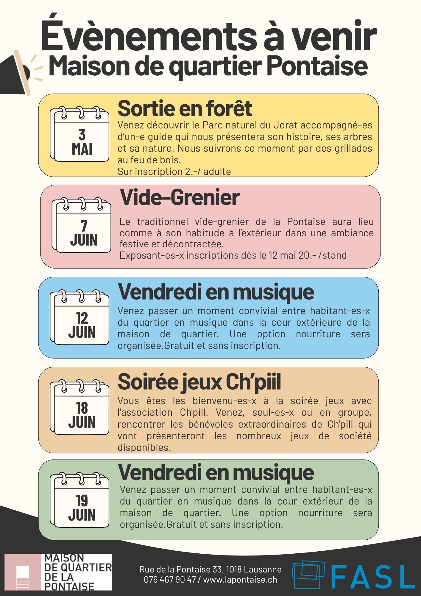 Sur inscriptions jusqu'au jeudi 30 avril, 2.- / adultes.